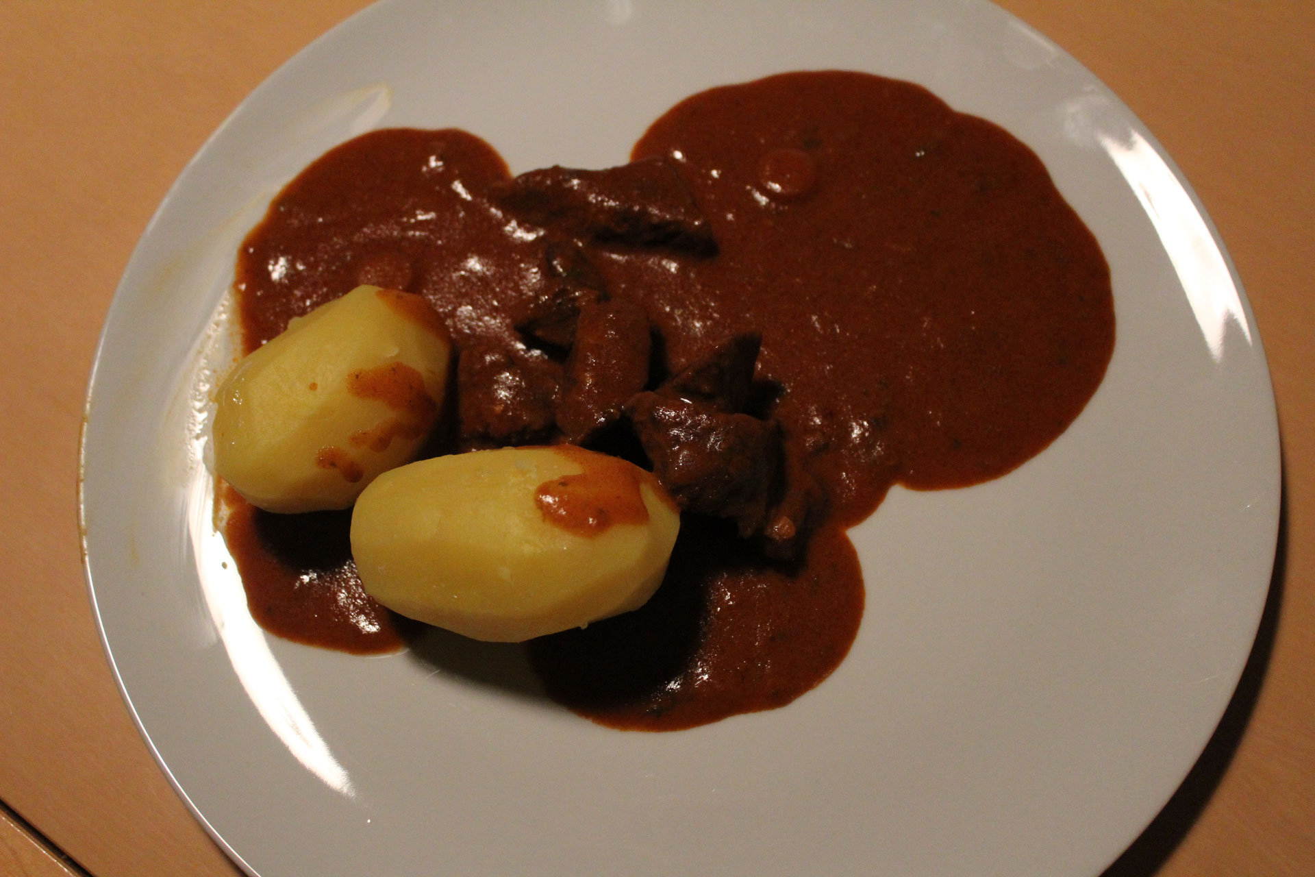 Nun gibt es zwei Möglichkeiten. Entweder das Gulasch flüssiger genießen, wobei die ganzen zerkochten Zwiebeln eine gewisse Dichte geben. Oder, wenn man eine dicke Soße möchte, dann Mehl mit kaltem Wasser verrühren und in das Gulasch unterrühren. Wenn man die zweite Variante vorzieht, dann bitte noch ca. 20 Minuten weiterköcheln, damit der Mehlgeschmack weg ist. Dazu Semmelknödel oder gekochte Kartoffeln. Oder beides.