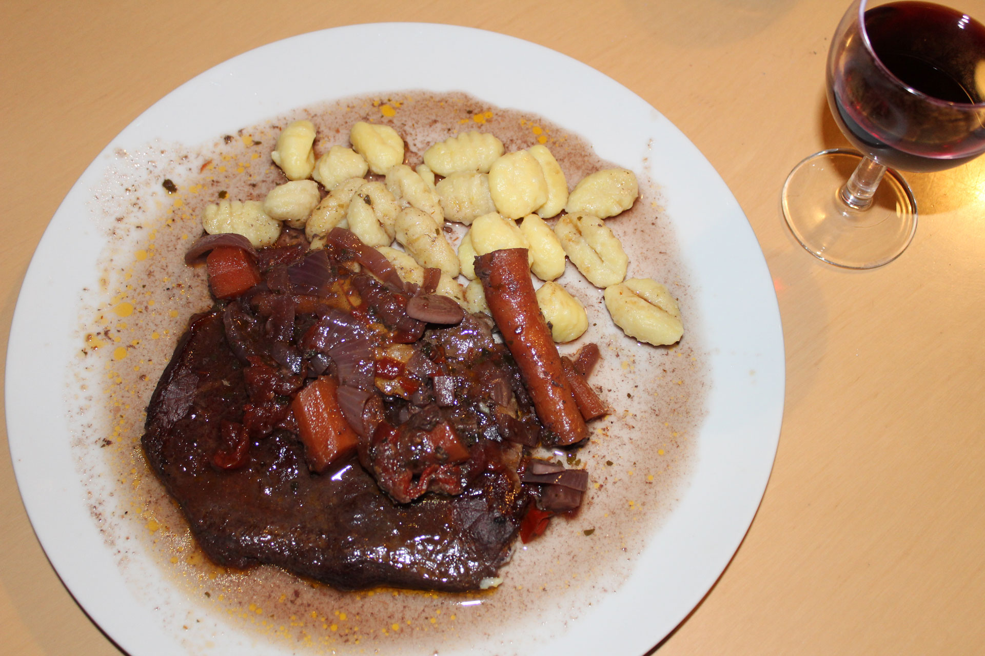 Als Beilage gibt es meistens Gnocci. Dazu passt derselbe Rotwein, mit dem man gekocht hat.