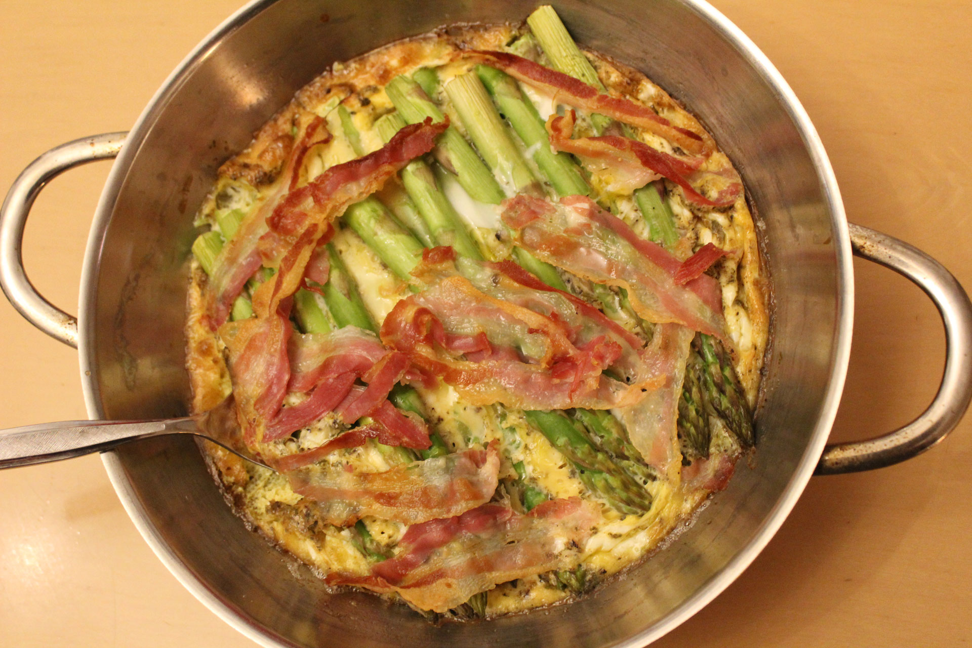 Dieses Gericht gibt es im Frühjahr überall in Istrien, da der grüne Spargel dort wie Unkraut wächst. Er ist dünner und etwas bitterer als der gezüchtete Spargel. Wenn man den Spargel mit ein wenig Zucker kocht, geht die Bitterkeit weg. Folgendes Rezept ist für zwei Personen gedacht.