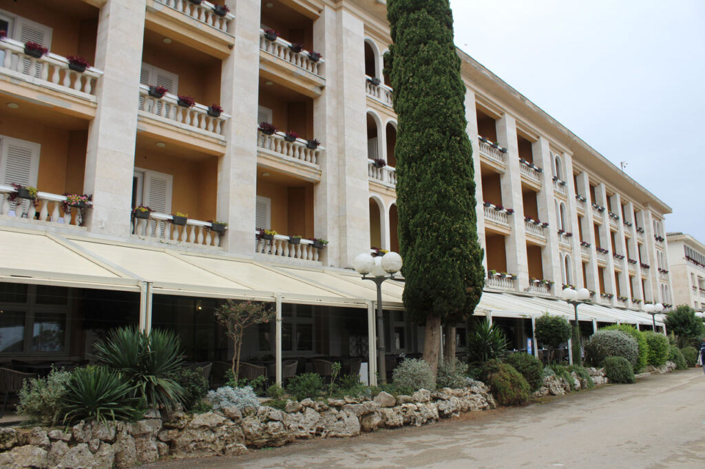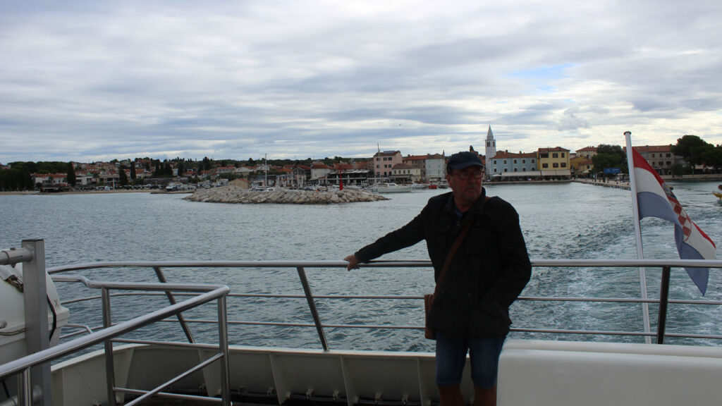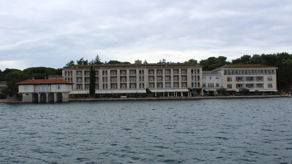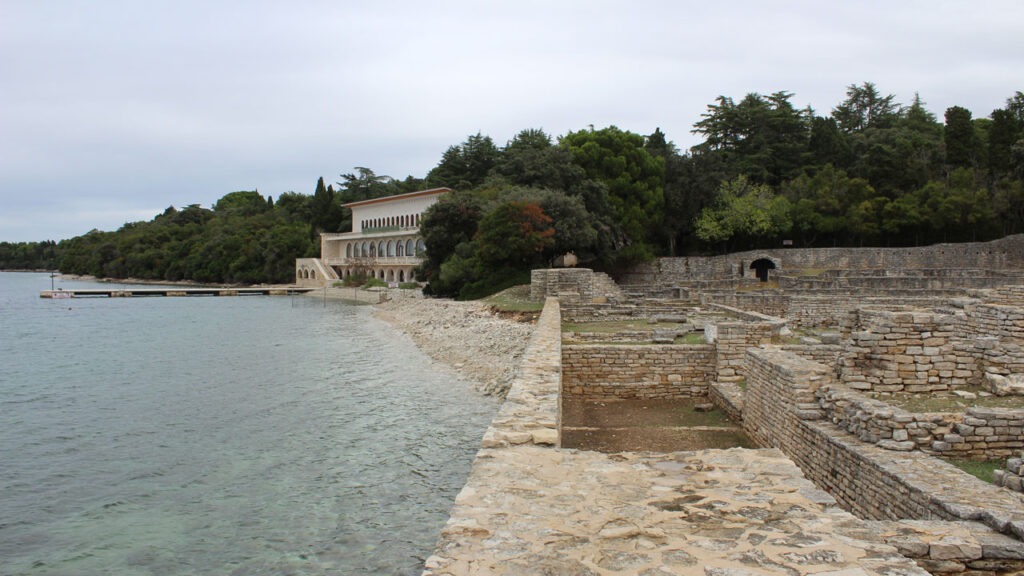 Heute ist kein schöner Tag. Es ist stark bewölkt, windig und sehr frisch. Nun gut, Mitte September kann man nicht jeden Tag Sonnenschein erwarten. Außerdem hat sich das schlechte Wetter schon am Vortag angekündigt. Der Jugo (Südwind) kam, das bedeutet schlechtes Wetter. Vorher war die Bora (Nordostwind), die immer schönes Wetter bringt. Ok, es wird ein Tag für einen Ausflug. Es ist naheliegend, dass, wenn man in Fažana, nördlich von Pula, Urlaub macht, die gegenüberliegende Insel Brijuni besucht. Wir machen uns auf den Weg zum kleinen Hafen, um uns Karten für die Überfahrt zu besorgen. Karten gekauft, das Stück für 35 Euro, nur für die Überfahrt. Man kann auch noch zusätzlich für den kleinen Traktorzug mit Führung buchen. Doch wir wollen die Insel auf eigene Faust erkunden. Wir fahren los. Die Überfahrt dauert ca. 15 Minuten. Auf dem Schiff ist es bitterkalt durch den Wind und ich bereue, dass ich keine wärmere Jacke mitgenommen habe. Wir kommen an und das Erste ist, rein in den ehemaligen Tito Palast auf einen Kaffee. Innen ist es so, wie es schon vor ca. 70 Jahren war. Alles noch original, die alten Sessel und Lampen, die Bar, nichts wurde verändert. Den Stil kann man nicht genau beschreiben, vielleicht als kommunistischen Prunk. Irgendwie faszinierend und unsympathisch zugleich. Jetzt schauen wir uns das kleine Museum an, das gleich neben dem Palast liegt. Es ist sehr interessant, der Tito war privat sehr egozentrisch, hatte es gern, wenn ihn berühmte Schauspieler besuchten, wie z. B. Elizabeth Taylor. Jetzt gehen wir zum Fahrradverleih und mieten uns zwei Räder. Wir haben die Wahl zwischen alten Rädern und ganz alten Rädern, beide ohne Gangschaltung. Wir starten los und möchten die ganze Insel umrunden. Nach kurzer Zeit stellen wir fest, wie wunderschön die Natur hier ist. Herrliche grüne Wiesen, wunderschöne Kiefernwälder. Kein Mensch weit und breit. Man hört nur die Stille und das Meeresrauschen. Es geht auch ständig eben dahin, somit hat sich die Gangschaltung erledigt. Unterwegs schauen wir uns die alten römischen Siedlungen an, schon in dieser Zeit war die Insel bewohnt. Und immer wieder schöne Wälder und Wiesen, wo Rehe weiden. Die meiste Zeit radeln wir am Meer entlang oder durch einen dichten Wald. Der Geruch vom Wald ist intensiv, wunderbar, dieser Waldsmog. Nach zwei Stunden Fahrt kommen wir wieder zum Tito Palast und warten auf das Schiff, das jede Stunde fährt. Es war wohl einer der schönsten Fahrradausflüge, die wir jemals gemacht haben. Und ich bin dankbar, dass das Wetter nicht gut war. Weil wir die Insel fast nur für uns alleine hatten.