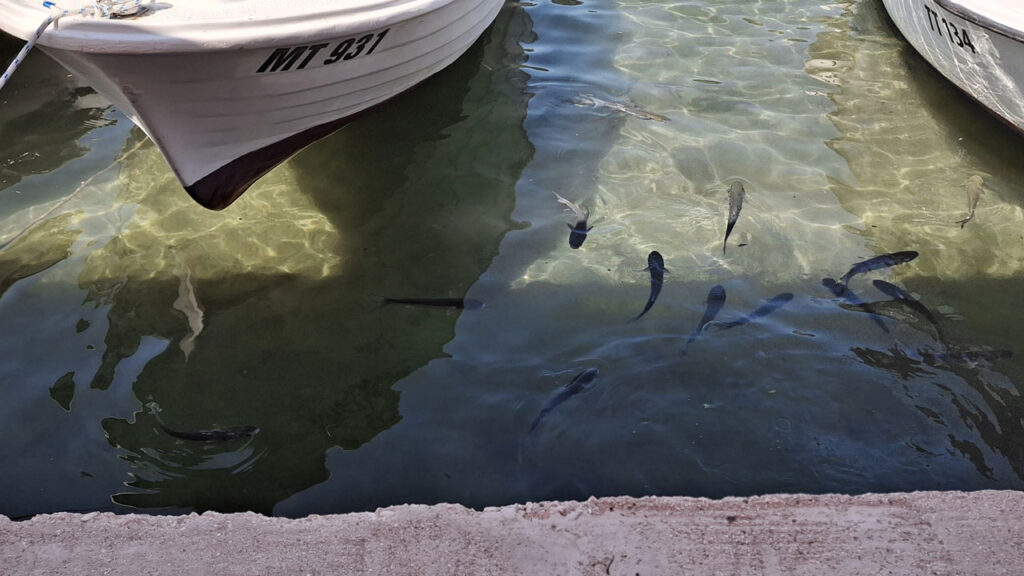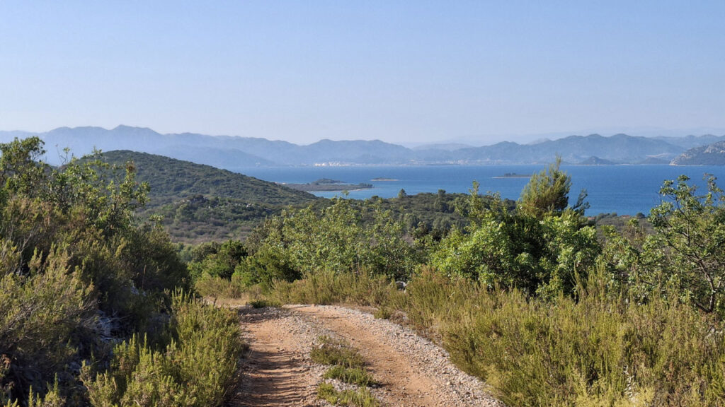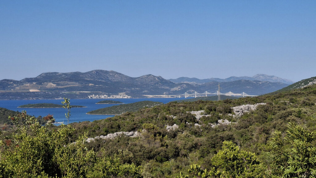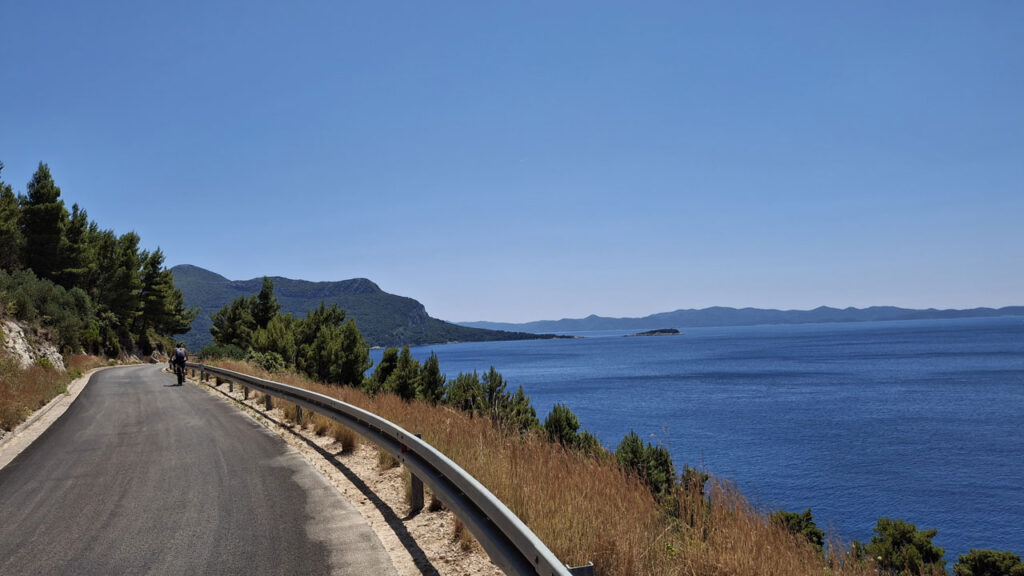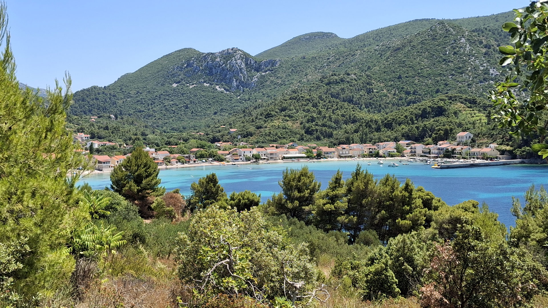 Wir beschließen heute einen Fahrradausflug in die andere Richtung, nach Südwesten, zu machen. Unser Ziel ist Žuljana, ca. 6 km von Trstenik entfernt. Bei der großen Weinkellerei biegen wir hinunter ans Meer. Ein wilder Schotterweg, durch Wald und Gestrüpp, manchmal auch Weinfelder. Nach ca. 1 km durch das Gestrüpp kommt eine steile Steigung zur asphaltierten Straße in Richtung Žuljana. Ist nicht angenehm, die Fahrräder rauf zu schieben. Geschafft, weiter geht es auf der neu asphaltierten Straße, eigentlich immer schön gerade, keine Steigungen und sehr wenig Verkehr. Das Meer im Blick, wunderschön. Nach relativ kurzer Zeit sehen wir unter uns Žuljana. Wir fahren hinunter und lassen die Fahrräder in einer Seitengasse stehen. Žuljana besteht hauptsächlich aus einem langen Sandstrand und daneben zwei Häuserreihen. Ein kleines, sympathisches Fischerdorf. Das Meer ist seicht, wir sehen viele Familien mit Kindern. Bekanntlich gibt es in Kroatien selten Sandstrände. Nun gut, der Hunger hat sich gemeldet, trotzdem gehen wir noch weiter an der steilen Küste einen wilden Weg entlang. Und da sind lauter kleine, versteckte und schattige Kiesstrände. Auf dem Rückweg entscheiden wir uns für eine Konoba, die direkt am Hafen liegt. Wie essen gegrillte Makrelen und bestellen uns einen weißen Hauswein dazu. Da direkt neben uns im Hafen sich Schwärme von Makrelen tummeln, gehen wir davon aus, dass der Koch diese in der Früh direkt aus dem Meer geholt hat. Gut gestärkt, machen wir uns auf den Rückweg. Ich entschließe mich, den gleichen Weg zurück zu fahren, bis auf das letzte Stück, nicht den Schotterweg, sondern die normale Straße. Meine Frau entschließt sich, den Napoleon-Weg zu nehmen, der oberhalb verläuft. Eine Schotterstraße, einsam und wild, mit wenig Aussicht auf das Meer, Natur pur. An einem Punkt sieht man die Pelješac-Brücke in voller Pracht. Am Abend wieder vereint, haben wir das Glück, im einzigen Restaurant von Trstenik einen schönen Platz direkt am Hafen zu bekommen. Ein schöner Abschluss am vorletzten Tag in Trstenik.