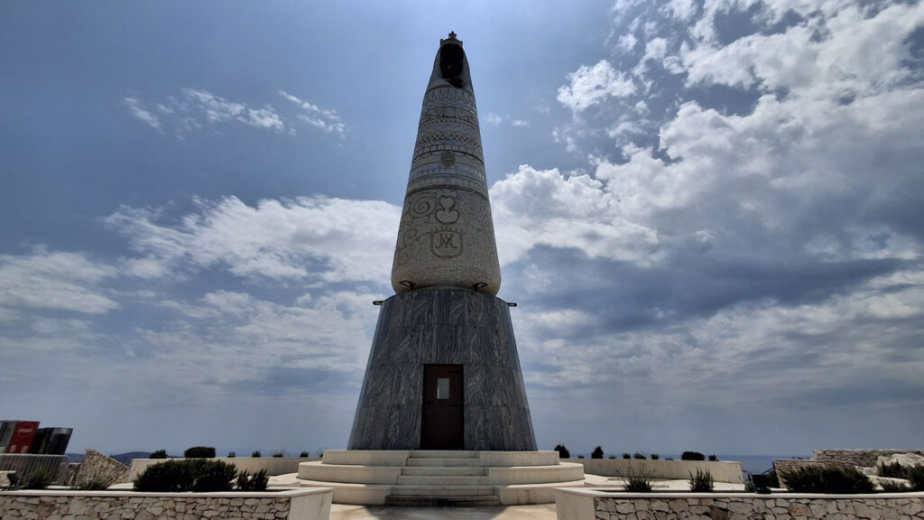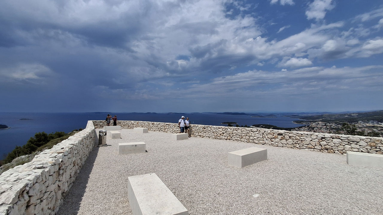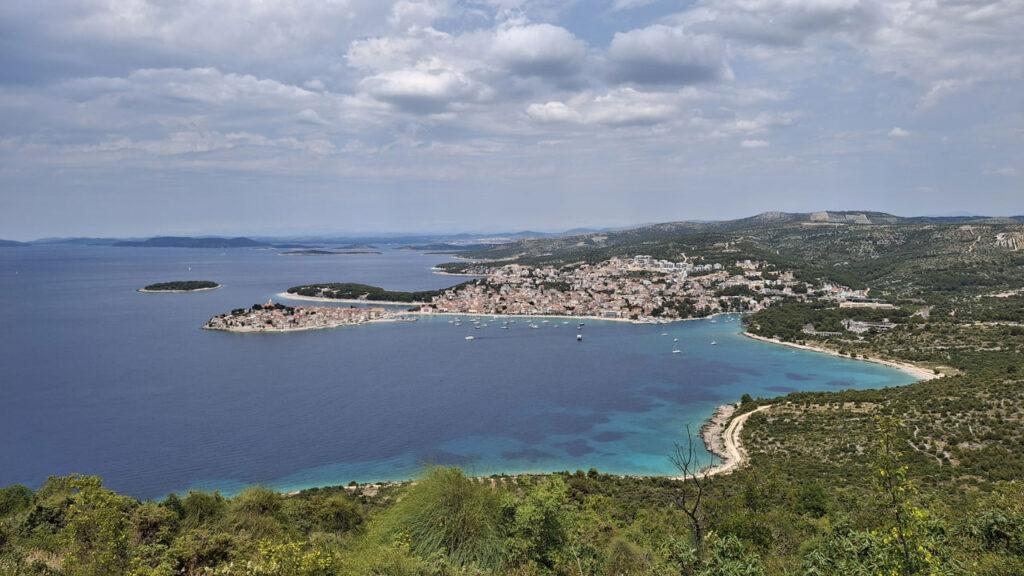 Loreta, die Statue der Jungfrau Maria von Loreto. Sie befindet sich auf einem 173 m hohen Berg, gegenüber von Primošten. Laut Einheimischen muss man diesen Berg zur Statue erklimmen. Und der Ausblick von oben muss atemberaubend sein. Gut, wir machen uns zu Fuß auf den Weg. Zunächst geht es am Meer entlang, bis zu einem steilen Schotterweg aufwärts. Nach einigen hundert Metern kommen wir auf eine asphaltierte Straße, immer den Berg hinauf. Man kann übrigens auf dieser Straße auch mit dem Auto fahren. Oben angekommen, zuerst ein Erfrischungsgetränk an der kleinen Bar. Und dann die Aussicht. Wirklich sehenswert, im Norden sieht man bis zur Stadt Šibenik, im Westen die Ausläufer der Kornati Inseln und im Süden das weite Meer. Es hat sich wirklich gelohnt, allein die Aussicht war das wert. Die Statue selbst ist wunderschön, die Historie sagt, dass die Madonna von Loreto im zweiten Weltkrieg das Städtchen Primošten vor der italienischen Besatzungsmacht beschützt hat.